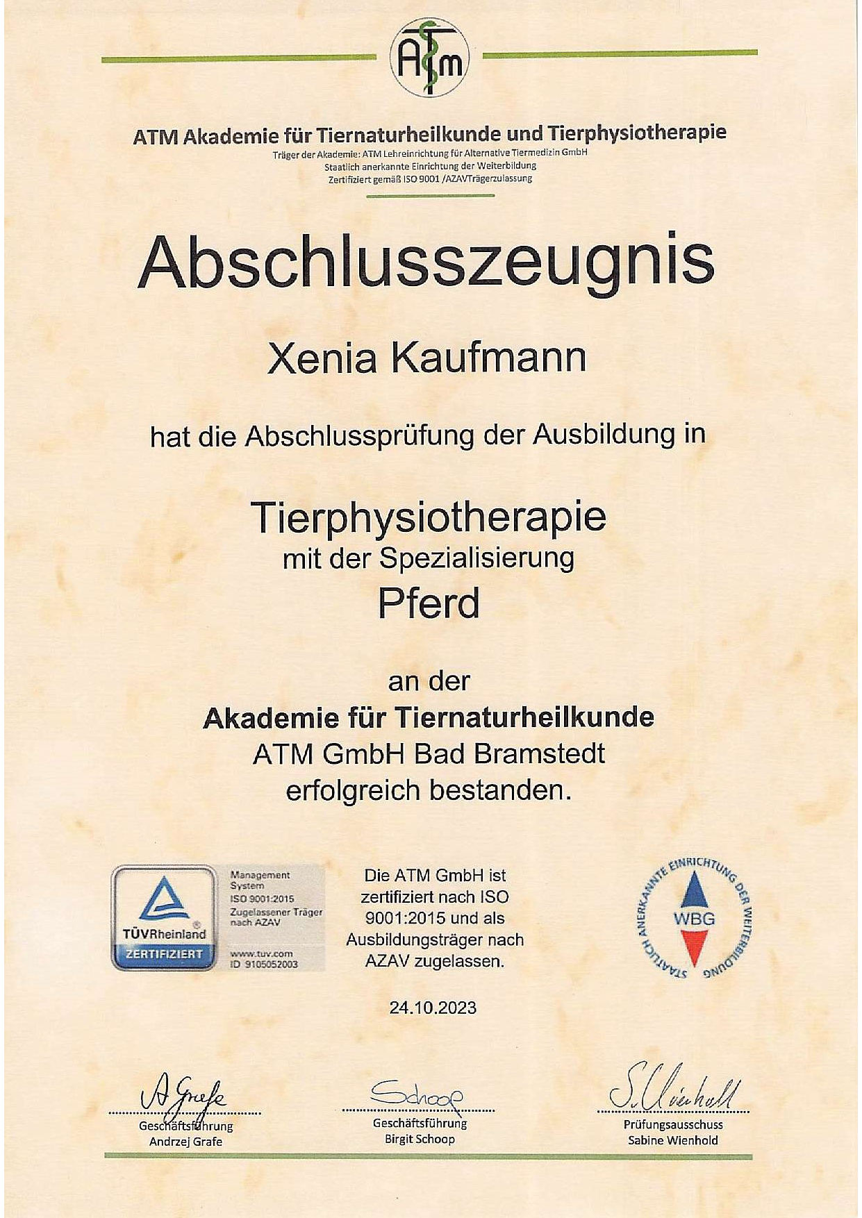 Diese Qualifikationen ermöglichen es mir, ganzheitlich und individuell auf jedes Pferd und seine Bedürfnisse einzugehen, um eine gesunde und respektvolle Partnerschaft zwischen Mensch und Tier zu fördern.